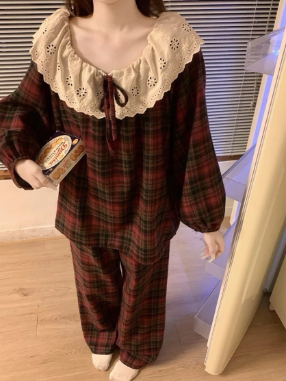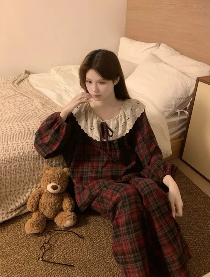 Bộ Đồ Ngủ Kẻ Sọc Đỏ Thắt Nơ Xinh Xắn Áo Tay Dài Quần Dài Nữ Women Có Size 65kg